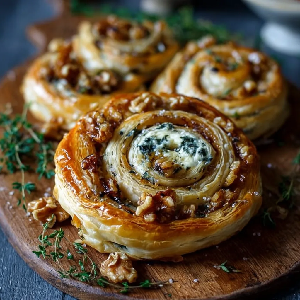 Flaky puff pastry spirals filled with creamy blue cheese, toasted walnuts, and fresh thyme—perfect for entertaining or pairing with wine.