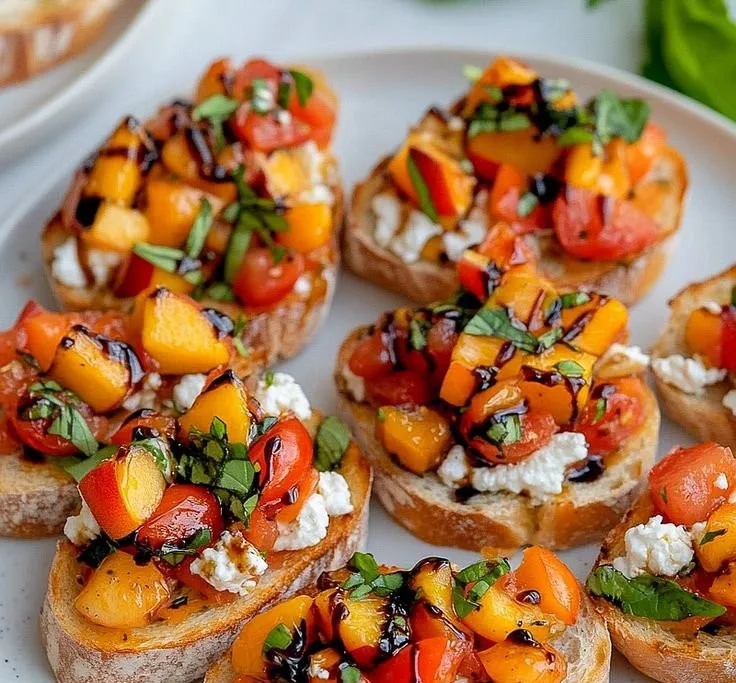 - Top with the peach mixture and garnish with fresh basil leaves.