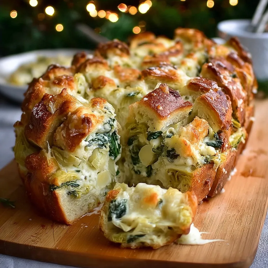 A golden, buttery bread shaped like a Christmas tree, stuffed with creamy spinach-artichoke dip—perfect for parties and family gatherings.